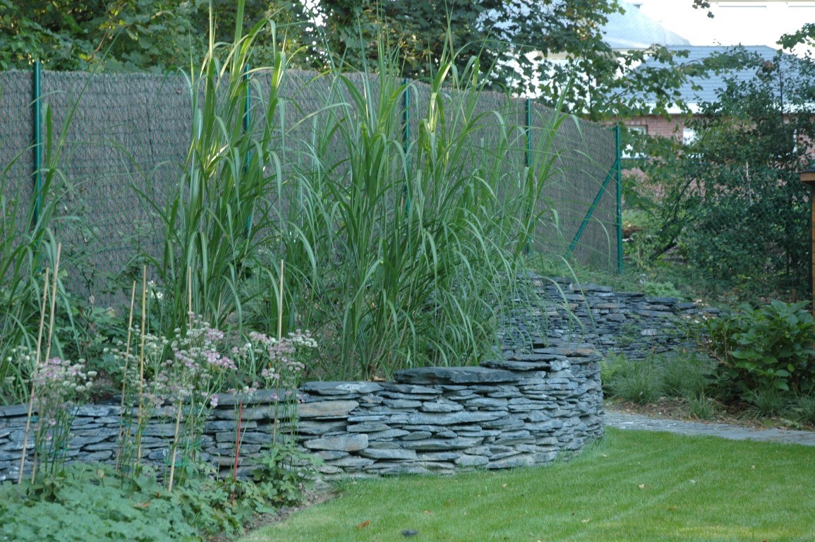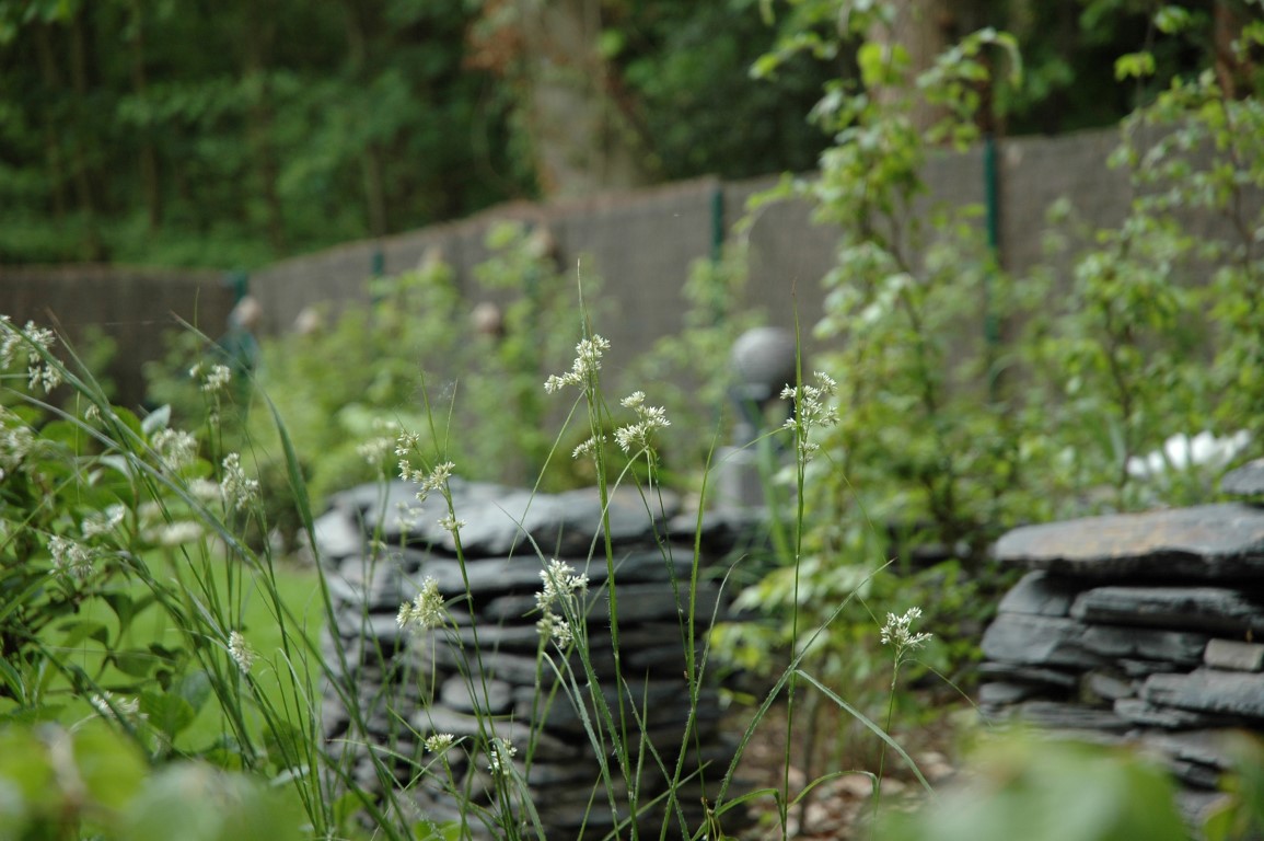 Au cœur de ce jardin humide et de sous-bois, l'aménagement se dessine à travers la pierre, matière brute et ancestrale. L'élément central de cette réalisation réside dans ses murets en maçonnerie sèche de schiste, qui serpentent avec élégance au milieu d'une végétation légère et vaporeuse. Loin de la rigidité des murs maçonnés au mortier, ces structures épousent les courbes du terrain, créant un circuit souple qui invite à l'exploration et au voyage intérieur.