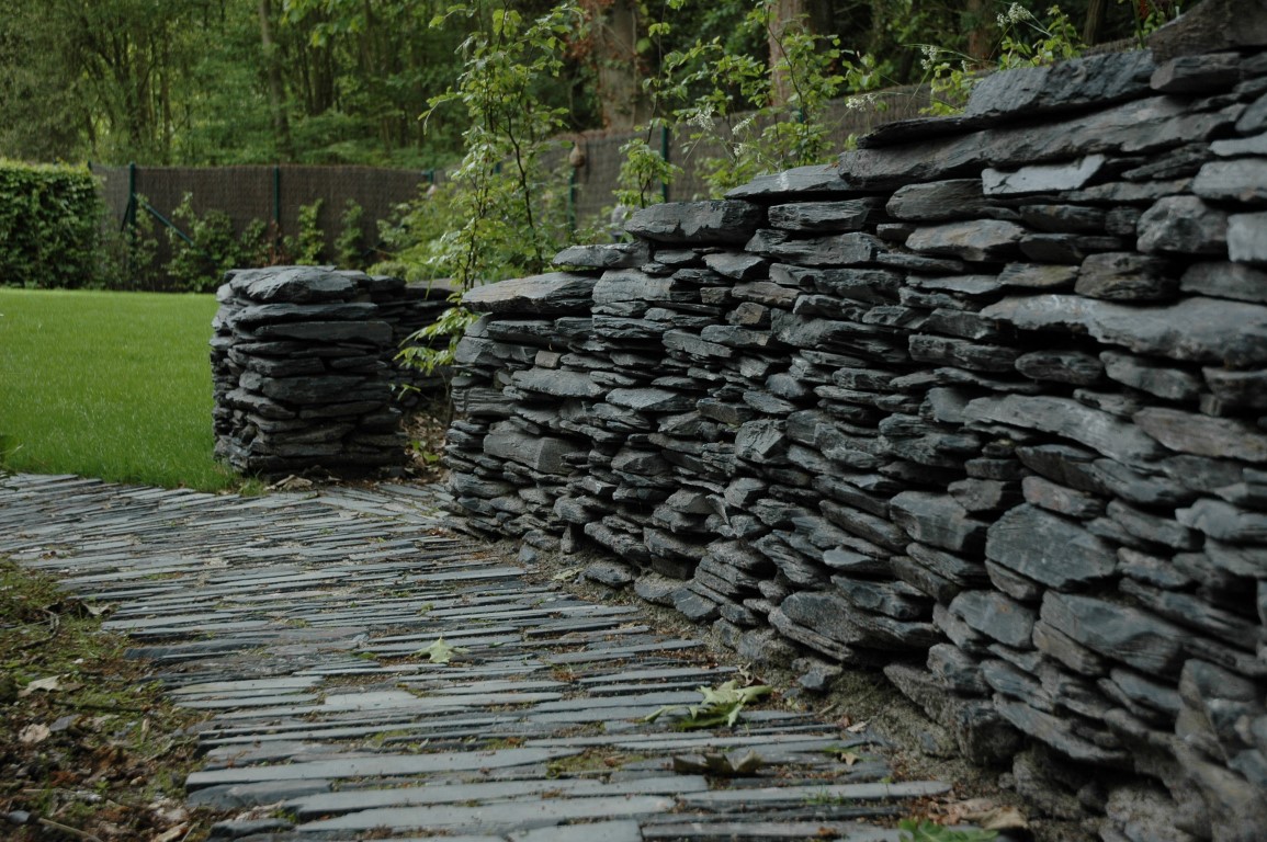 Au cœur de ce jardin humide et de sous-bois, l'aménagement se dessine à travers la pierre, matière brute et ancestrale. L'élément central de cette réalisation réside dans ses murets en maçonnerie sèche de schiste, qui serpentent avec élégance au milieu d'une végétation légère et vaporeuse. Loin de la rigidité des murs maçonnés au mortier, ces structures épousent les courbes du terrain, créant un circuit souple qui invite à l'exploration et au voyage intérieur.